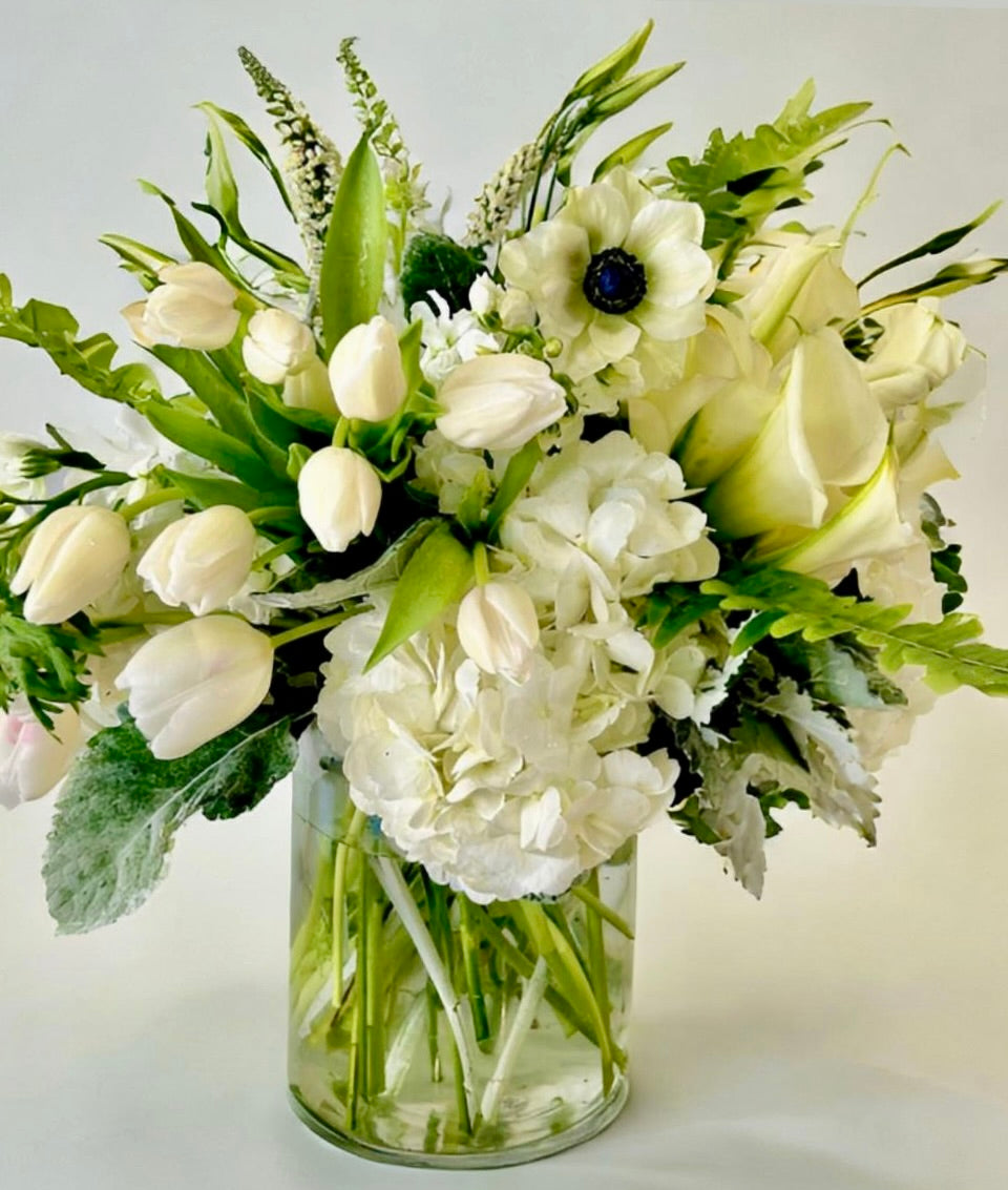 All of our floral designs are uniquely designed and tailored using only the freshest hand-selected seasonal flowers available. Flowers will be created in a porcelain or glass vase. Image shown is an example of the overall scale and style you can expect from our work.